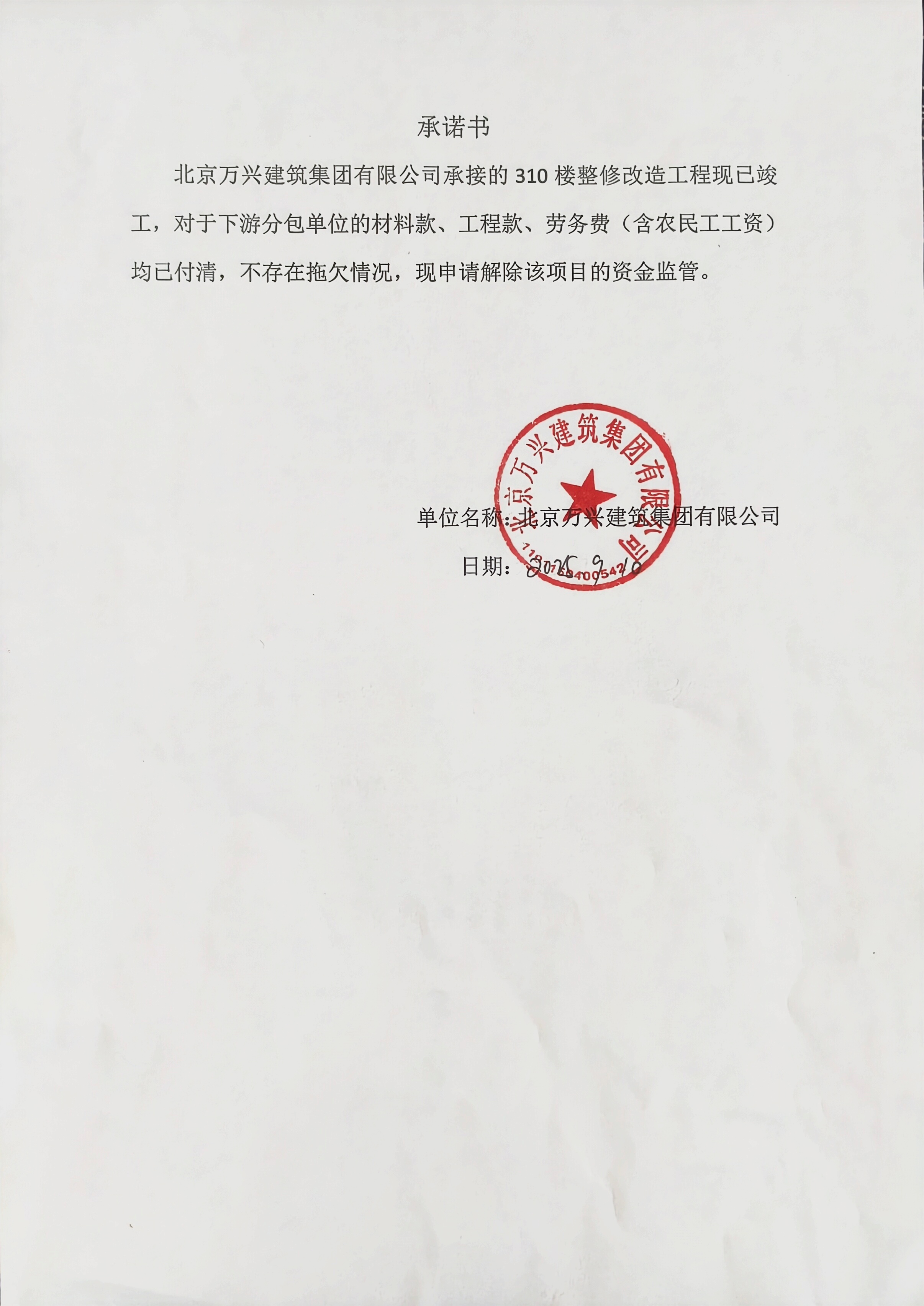 2025年9月10日,北京萬(wàn)興建筑集團(tuán)有限公司針對(duì)承接的310樓整修改造工程申請(qǐng)解除資金監(jiān)管做出承諾,現(xiàn)將《承諾書》(附件1)在本網(wǎng)站進(jìn)行公示。
